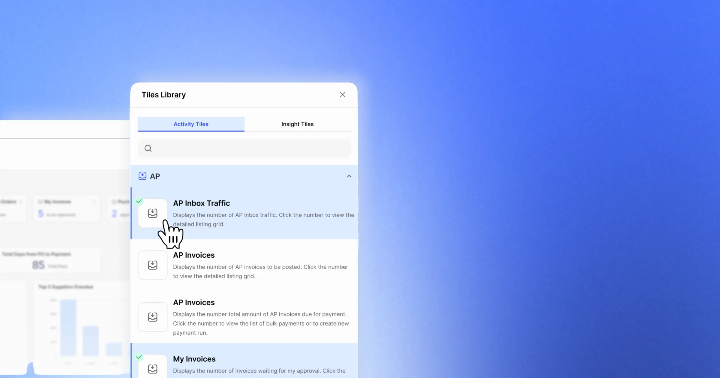 Each user sees tiles relevant to their role, whether you’re in AP, AR,Finance Management or a CFO.